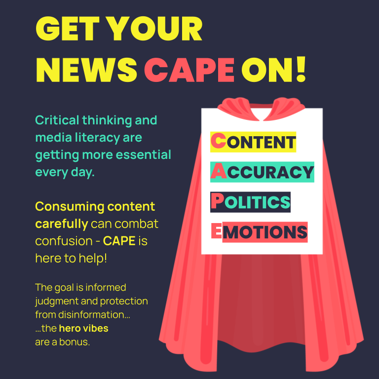 The CAPE toolkit enables you to analyse any item in the news media by questioning its Content, Accuracy, Politics, and the Emotions it’s aiming to provoke.