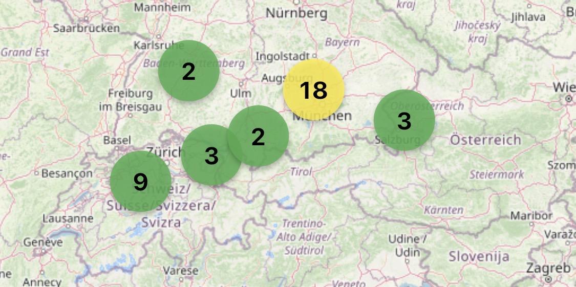 Map with Switzerland, Austria and south Germany, showing 30  Meshcore nodes everywhere.