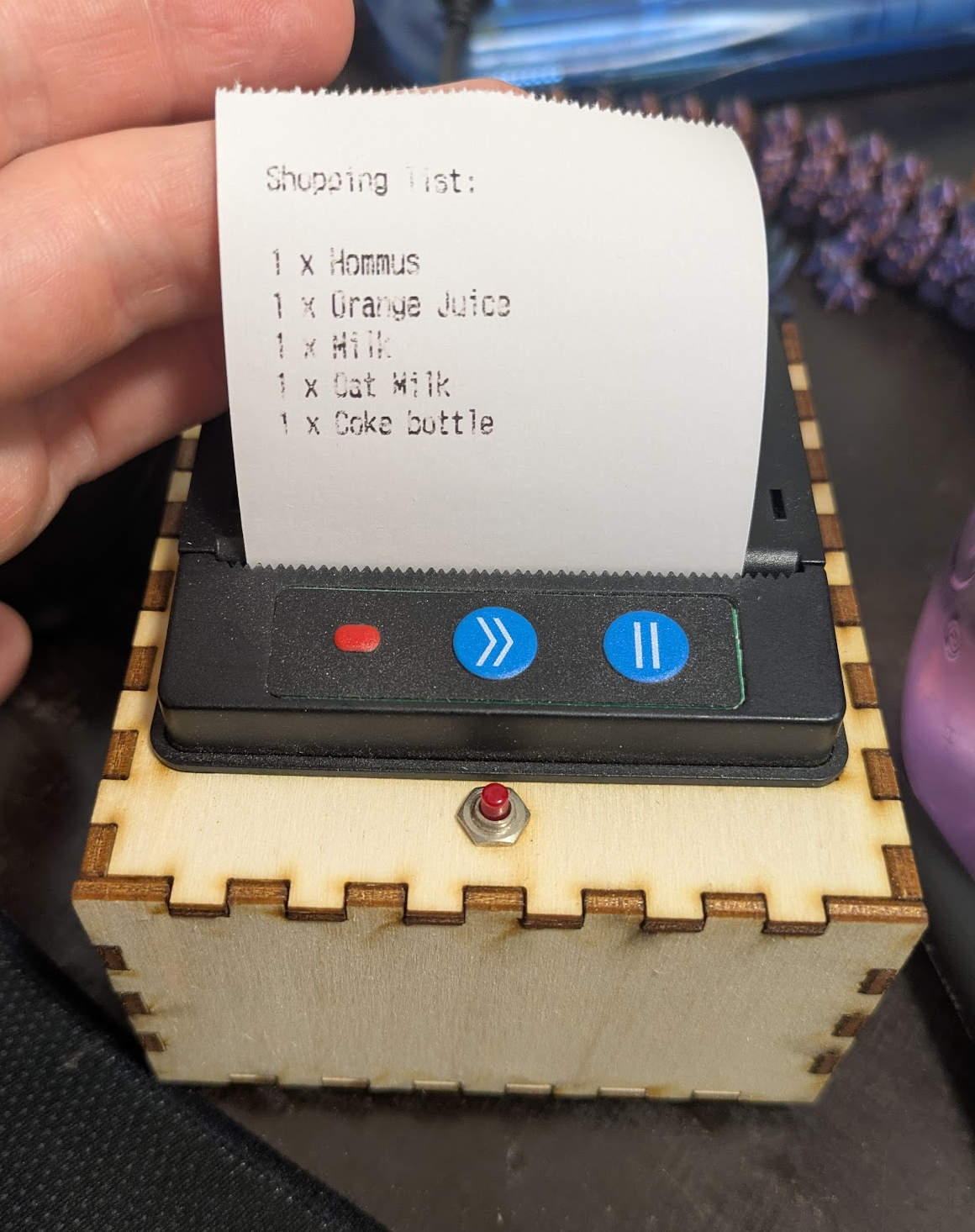 When you hit the button it publishes a message. A service on the server polls #grocy for the current shopping list and publishes it out onto the print topic.