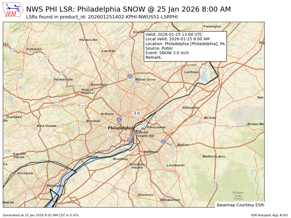 At 8:00 AM EST, Philadelphia [Philadelphia Co, PA] Public reports Snow of 3.00 Inch #pawx https://mesonet.agron.iastate.edu/lsr/?by=wfo&wfo=PHI&sts=202601251300&ets=202601251300