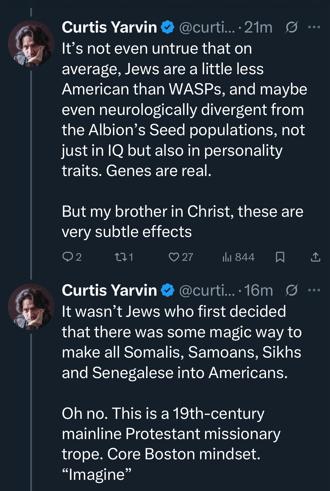 It's not even untrue that on average, Jews are a little less American than WASPs, and maybe even neurologically divergent from the Albion's Seed populations, not just in IQ but also in personality traits. Genes are real.