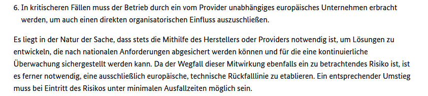 @pallenberg @bsi hmm, also entweder beschreibt das die Quadratur des Kreises, oder es macht außereuropäische Unternehmen von vornherein wirtschaftlich uninteressant. Denn wenn ich mit minimalen Ausfallzeiten auf eine 100% europäische Lösung wechseln können muss, dann muss ich die entsprechende Infrastruktur und Vertragswerke schon gesichert haben - dann wird es einfacher sein, gleich dort zu laufen.